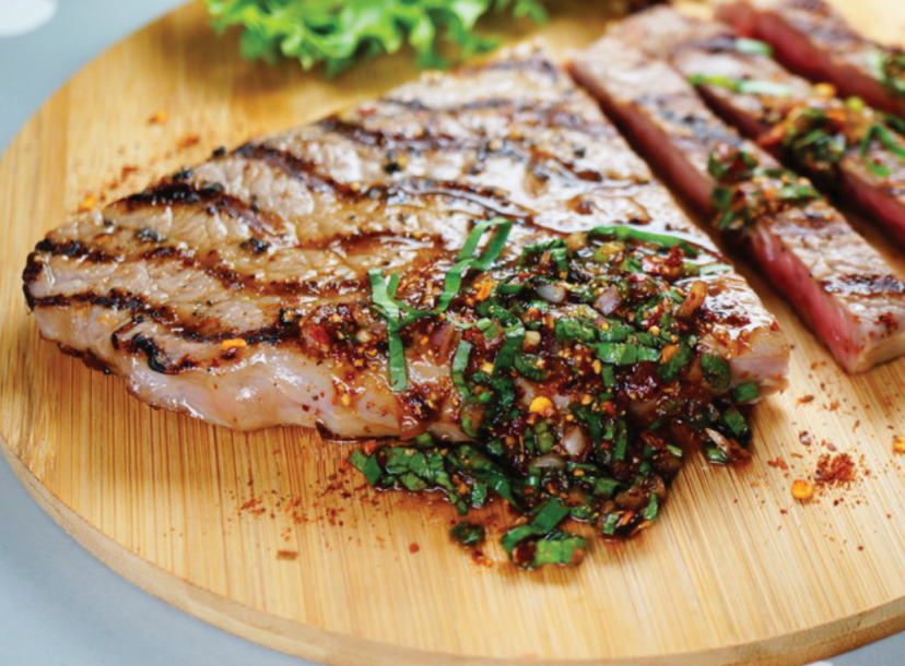 สเต็กเนื้อน้ำมันหอยราดแจ่ว
