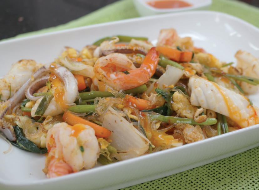 - ใส่ปลาหมึกกรอบ และเนื้อไก่ลงไปคั่วจนไก่สุก