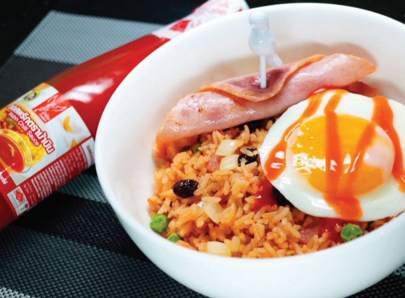 - คว่ำจานลงในกระทะ พลิกกระทะกลับมา เพื่อให้ไข่ที่ห่อไว้อยู่บนจาน ราดด้วยซอสพริกตราม้าบิน ตกแต่งด้วยกุ้งสด และใบมะกรูดหั่นฝอย