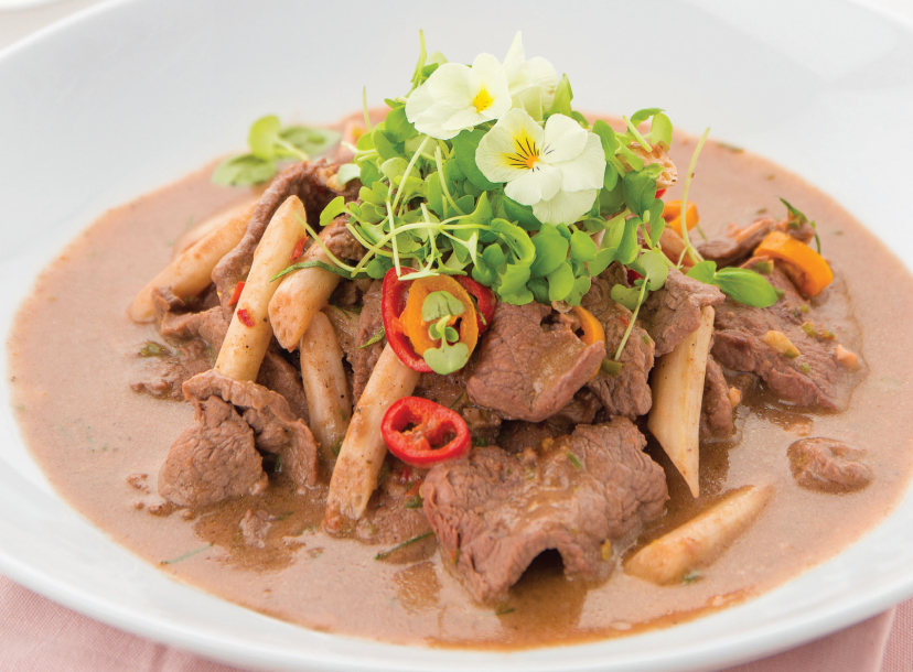 - ใส่ใบมะกรูด และพริกชี้ฟ้าแดง ผัดต่อจนน้ำแกงเขียวหวานงวด